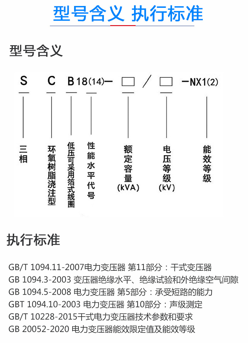 SCB表示三相樹脂澆注干式變壓器,14表示變壓器性能序列水平,1250指變壓器的額定容量,10kV是變壓器的額定電壓,NX2標注為二級能效變壓器,是滿足二級能效的1250KVA干式變壓器。