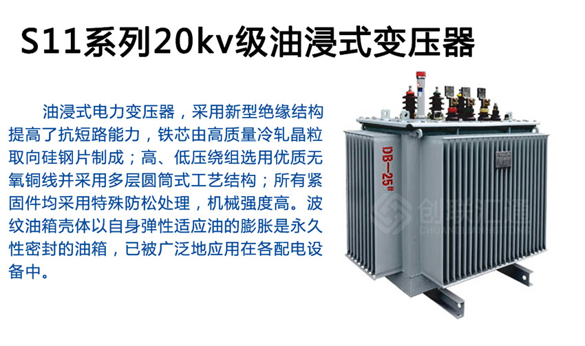S11系列20kv級油浸式變壓器為配電網(wǎng)絡與工礦企業(yè)供配電系統(tǒng)中的重要設備,在工礦企業(yè)、農(nóng)業(yè)和民用建筑中廣泛使用,也可用于石油、化工行業(yè)中多油污、多化學物質的場所。使用環(huán)境:戶外/戶內(nèi)使用,海拔不超過1000m。